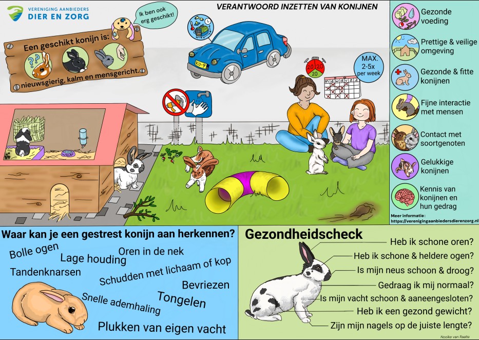 9 december 2025 heeft Nooike Raalte een webinar gegeven voor de branchevereniging Dier en Zorg over konijnen in AAS. Het webinar is opgenomen en nu te vinden op de website van de VADZ. In het webinar is aandacht besteed aan het welzijn van het konijn en hoe je deze kunt waarborgen. Hiervoor is ook een poster gemaakt en een welzijnsprotocol. het protocol is geschreven om het welzijn van konijnen te bewaken die in de zorg en het onderwijs voor sociale- emotionele doeleinden worden ingezet. Dit protocol kan echter ook worden gebruikt voor konijnen die voor andere doeleinden gehouden worden. In dit protocol zijn er richtlijnen opgesteld aan de hand van de vijf domeinen van Mellor. Dit protocol begint bij het eerste domein, voeding vervolgens worden de omgeving, gezondheid en gedragsinteracties besproken. Daarnaast vindt u signalen van stress, pijn en blijdschap onder het hoofdstuk de mentale staat. Als laatste vindt u ook informatie over de eisen die gesteld kunnen worden aan de professional en de cliënt, zodat de interventie veilig kan plaatsvinden. Dit protocol is onderbouwd met literatuur en een expertinterview. Deze onderbouwing is te vinden op onze website in het document ‘onderbouwing welzijnsprotocol konijnen in de zorg’.